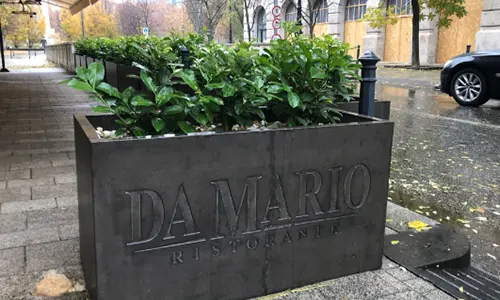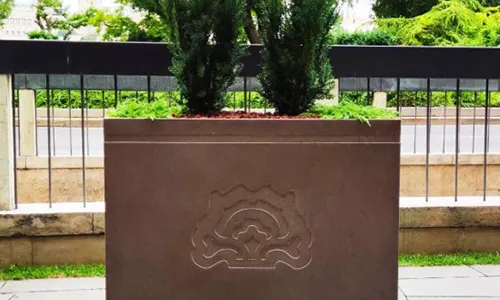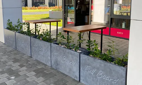 Az egyedi, logóval ellátott beton virágláda tökéletes választás a külső teraszra.